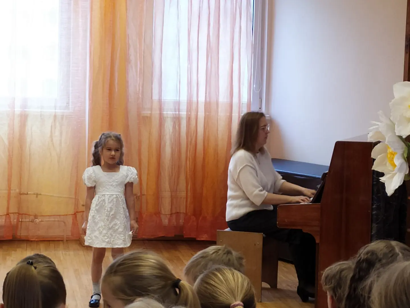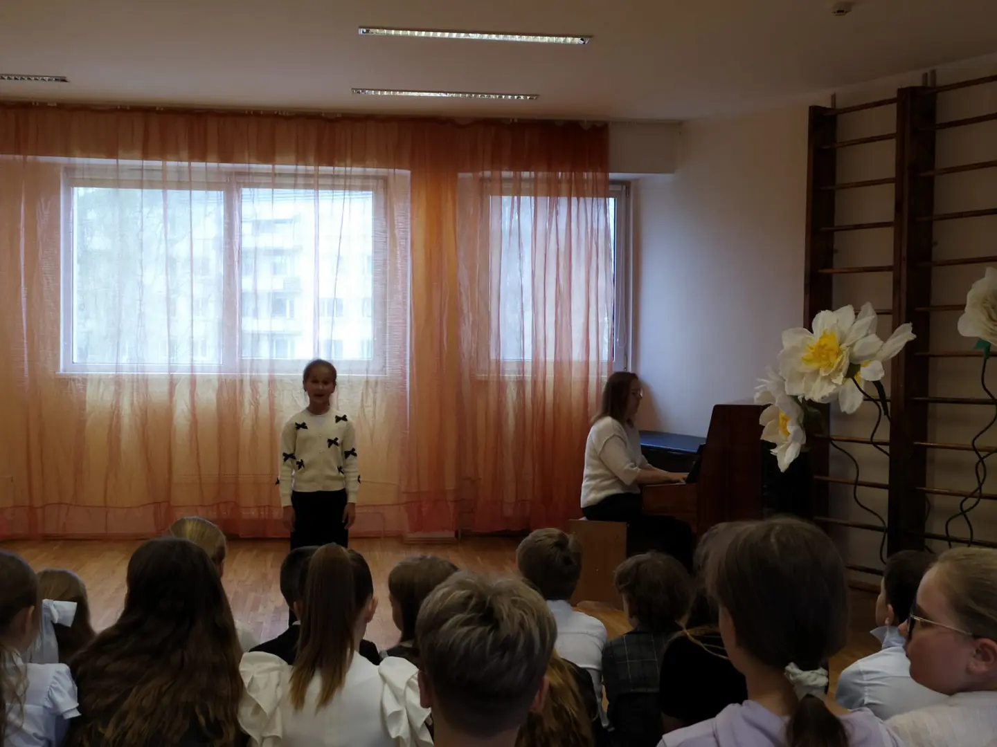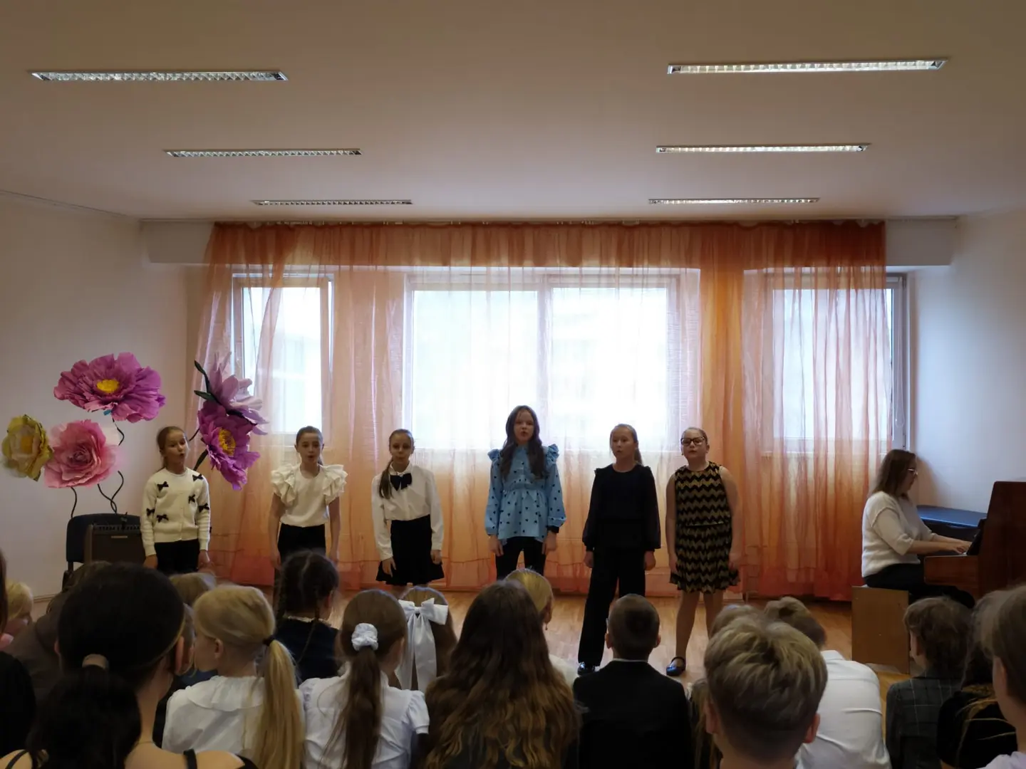Koncerta pirmajā daļā uzstājās skolas kora klašu audzēkņi un jaunāko klašu koris, izpildot Egona Valtera radītās dziesmas. Skatītājus priecēja tādi skaņdarbi kā “Vai klusēšana zelts?”, “Vējiņš mazs un bērniņš mazs”, “Runcis Mika un Miedziņš”, “Sprīdītis”, “Sienā zēns” un “Dziesmu māja”. Katrs priekšnesums atklāja bērnu prieku muzicēt un komponista radīto melodiju sirsnību. Arī kora klases solistēm – Nikolai Skribānei, māsām Evelīnai un Gabrielai Ezerkalnām, kā arī Sindijai Galdiņai – koncerts bija īpašs izaicinājums, jo bija ne tikai jāatklāj dziesmu raksturs un noskaņa, bet arī jāpārvar satraukums, uzstājoties publikas priekšā. Koncertā savu pirmo uzstāšanos piedzīvoja arī kora klases meiteņu ansamblis, kurā kopā ar jau iepriekš minētajām dalībniecēm muzicēja arī Daniela Džuljeta Ballone, Lillija Selga un Karlīna Šmite.